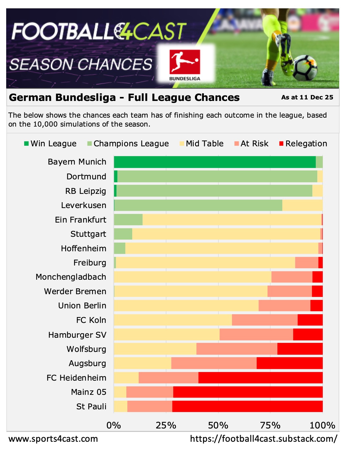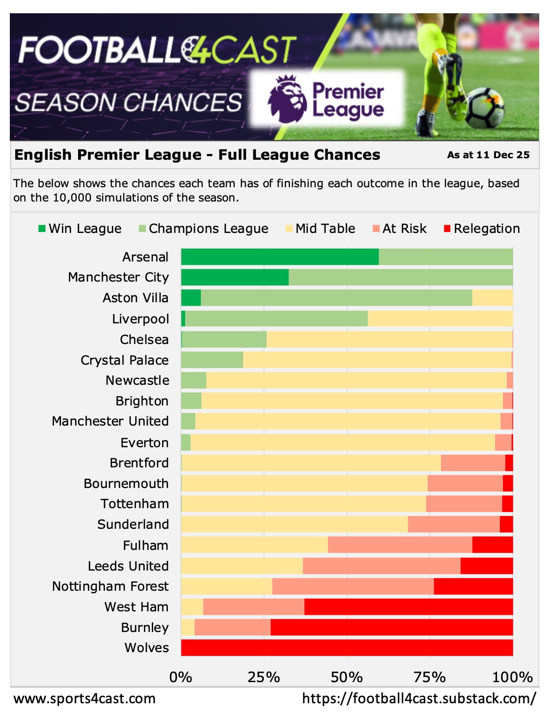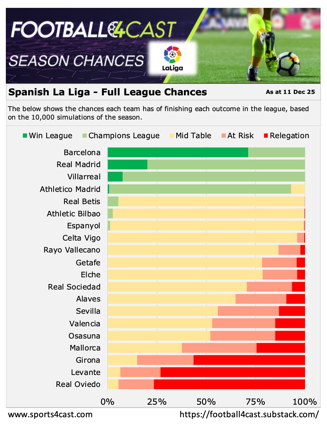 🏆 Below is our season analysis for each league, showing the chances each team has of finishing in each ‘bucket’ - based on 10,000 simulations of each tournament. 📊